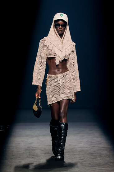 Muchas piezas nos sorprendieron por sus volúmenes, relieves y construcciones casi imposibles en la estructura de los looks. Una mirada de pantera, unas manos negras que actuaron como parte de arriba y una mini falda con abertura en el lateral fue el primer look y uno de los más impactantes. A este le siguió otro algo más sencillo, pero que combinaba varios materiales como la gasa transparente negra en la parte de arriba, un corset en un tono marfil, y unos pantalones que mezclaban los anteriores colores en una sola prenda. Las siguientes series siguieron la misma línea e incluso algunos carecieron de parte de arriba, mostrando tan solo los accesorios en un color oro que brillaba bajo la luz de los focos. Piezas en color azul y blanco, con parches superpuestos en las chaquetas y pantalones, en los que podemos ver un grabado hecho a mano de diferentes tipos. Y por último, una falda platillo con el logo de la parca en relieve digna de admirar.