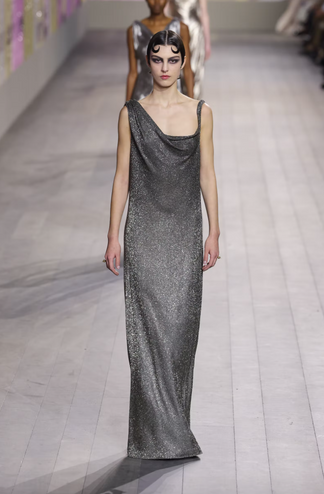 Hubo vestidos brillantes con pedrería de estilo Deco que recordaban en cierto modo a los vestidos de las flapper. Hubo momentos en los que los looks eran de salón, con pantalones de claqué plateados o lencería estructurada, pero cubiertos con batas de terciopelo. A un tercio del desfile llegó un extraordinario traje midi de cloqué dorado, cuya chaqueta recordaba a la icónica chaqueta Bar de 1947, pero estructurada, sin corsetería, para ceñir el cuerpo en lugar de ceñirlo. Nos mostró una colección sensual, repleta de texturas que pedían ser estrechadas contra el cuerpo, ya fuera en forma de terciopelo o de seda. Varios looks se combinaron con la versión de alta costura de una bata, todo muy Dior. "La línea de esta colección es más años 20", dijo. "Más limpia, menos volumen, más mi actitud". Su Christian Dior se basa en "renovar" y hacer que el canon clásico de la casa sea más ligero y fácil de llevar.