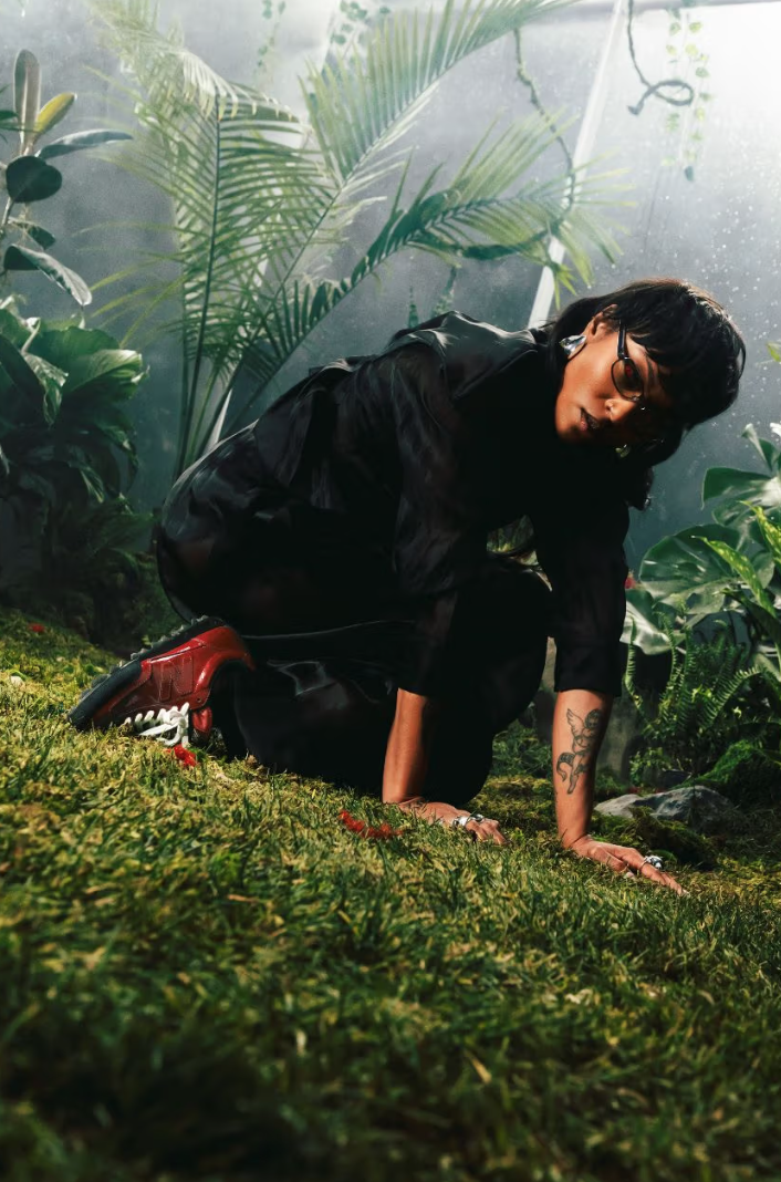 La campaña es otro nivel: Brittany Byrd camuflada en la vegetación verde del pantano, mientras los Shadow Red dominan el encuadre como protagonistas absolutas. Es performance, es arte, es scroll-stopping puro. No es solo una sneaker, es un objeto de culto digital, lista para alimentar feeds de Instagram, moodboards y conversaciones de streetwear.