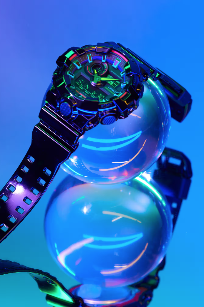 "Virtual Rainbow" aprovecha la vinculación de G-SHOCK con la cultura de los videojuegos a través de un diseño con toques cibernéticos que utiliza resina negra brillante y tonos iridiscentes para crear una estética futurista. El efecto prisma ofrece la fachada robusta característica de la marca, con una iluminación hipnótica que embellece la esfera y las manecillas. Adaptando una historia de color RGB, la colección complementa las configuraciones de los jugadores a la vez que toma la influencia del diseño de los modernos entornos digitales y virtuales.