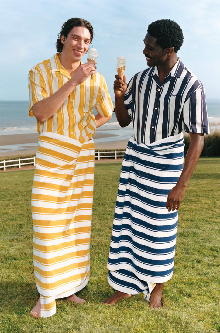 Combinando colores vivos con blancos clásicos, la nueva propuesta captura la fiesta nupcial definitiva, con las damas de honor vestidas de rojo vivo y los invitados de boda envueltos en toallas de color amarillo y azul brillante.