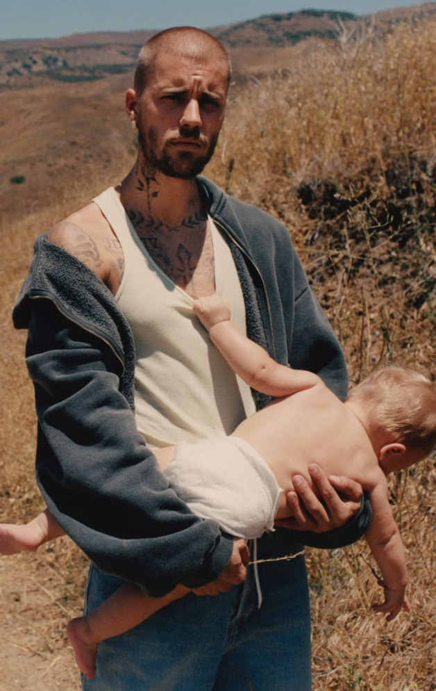 En varias imágenes, Bieber aparece cargando a su hijo Jack Blues, con el rostro cubierto. Hailey también hace apariciones, solidificando esa vibra doméstica y estable que ahora enmarca su arte.