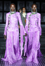 En un espectáculo de gemelos, casi nunca nos sentimos atraídos por el uno, el singular. En ese sentido, "Twinsburg" es menos una colección de prendas y más un escaparate artístico. Uno que tiene también su declaración de intenciones ya que el extravagante Michele no da puntada sin hilo. Es una forma de lo más elocuente de invitar a reflexionar sobre las falsificaciones. Por qué si quieres una copia de Gucci, sigue buscando en Gucci.