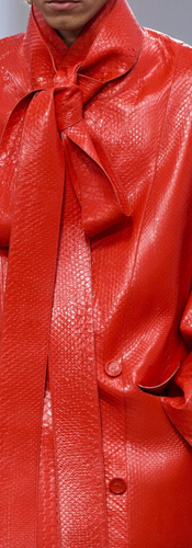 Continuando con las vibrantes combinaciones de colores de temporadas anteriores, la colección FW24 sigue haciendo gala de un exuberante uso de los tonos para crear la estética del arte pop que se ha infiltrado en la cultura pop y de masas a lo largo de los años. A juego con los cuadros de Hawkins, las piezas estaban llenas de texturas y eran atrevidas y animadas en toda la colección. Desde abrigos de cuero a escala que aún estaban en proceso de pintarse con spray con el tono adecuado momentos antes del desfile, hasta polos de colores colgados dentro de las chaquetas para crear otra dimensión de la ropa, la colección deconstruía las siluetas tradicionales y el uso de colores atrevidos.