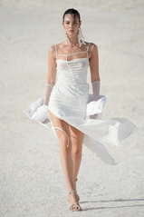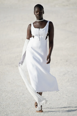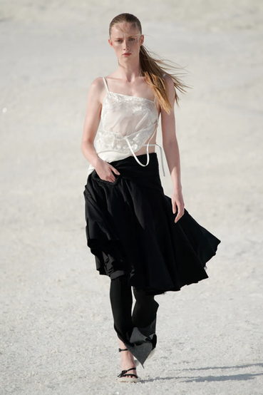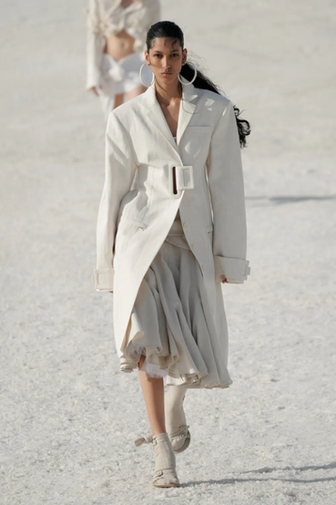 “Le Papier” se fundió a la perfección con el carácter natural de los materiales terrestres. La gama cromática giró en torno al blanco, beige, piedra, eucalipto, naranja atardecer y el marrón. El algodón, el tul, los encajes, las transparencias, los acolchados y las superposiciones se presentaron como un juego sensorial entre las prendas y lo natural. Una proyección de pureza, sencillez e inocencia. Una colección donde, nuevamente, el papel de la mujer no pasó desapercibido, y el escultor Diego Giacometti también tuvo su lugar. Asimismo, el viento y los reflejos del sol se colaron en el front row del desfile para bailar con los volúmenes, las caídas y las asimetrías. El Jacquemus del otoño-invierno 22/23 concibe la libertad y la frescura como invitados de la nueva estación.