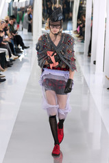 Las medias de rejilla siguieron siendo un pilar de la pasarela, y las modelos se agarraban a los bolsos mientras caminaban por la pasarela como si tuvieran prisa. Estos looks se combinaron con el característico Tabi de Margiela reinterpretado en brillantes zapatos de salón, mientras que las americanas y los abrigos lucían detalles de puntadas a la vista. Todo muy trash y elegante a partes iguales.