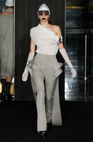 En la colección pudimos ver siluetas con mucha hombrera, elemento común en las creaciones del diseñador. Las transparencias tuvieron gran protagonismo, al igual que el terciopelo y el cuero. El negro fue el color predominante, aunque también hubo muchos tonos tierra y una aparición del borgoña, que está posicionándose como el color de moda. Además, siguiendo la estela del Y2K, Raúl diseñó un vestido chaqueta de animal print de leopardo a juego con unas botas que llegaban por debajo de la rodilla, las cuales también estaban en versión alta. Esta es la primera vez que la marca introduce zapatos; en concreto zuecos de cuero, botas de tacón y mocasines.