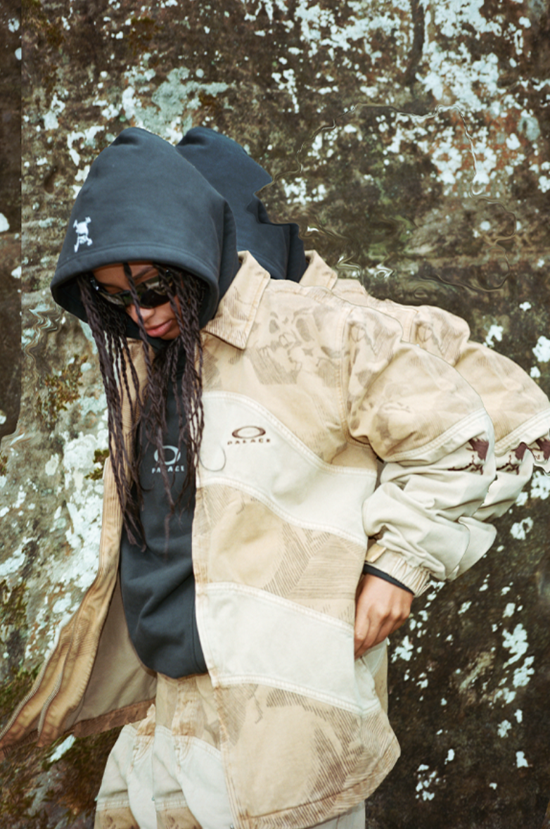 Palace x Oakley se inspira en las actividades al aire libre. Compuesta por gafas de sol y ropa, la colección se inspira en el rico archivo de Oakley, a partir de diseños de principios de la década de 2000 que se fusionan con los básicos de Palace. La colección, que incluye una chaqueta de trabajo y un pantalón de 5 bolsillos en tonos "arena", ofrece una visión futurista de los estampados de camuflaje tradicionales y los diseños para actividades al aire libre.