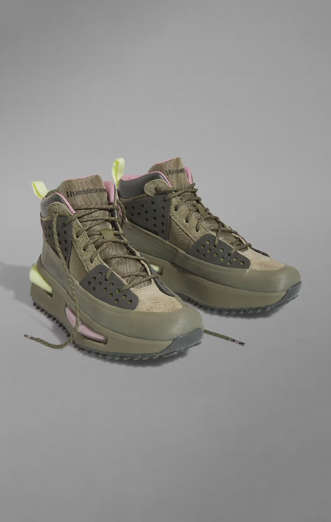 La parte superior de las zapatillas, fabricada con ante y cuero, está vestida con un tono caqui apagado, mientras que los colores rosa pastel y amarillo neón difuminado acentúan el diseño en la entresuela, el talón y el forro. El diseño se completa con el logotipo de Humanrance en la lengüeta.