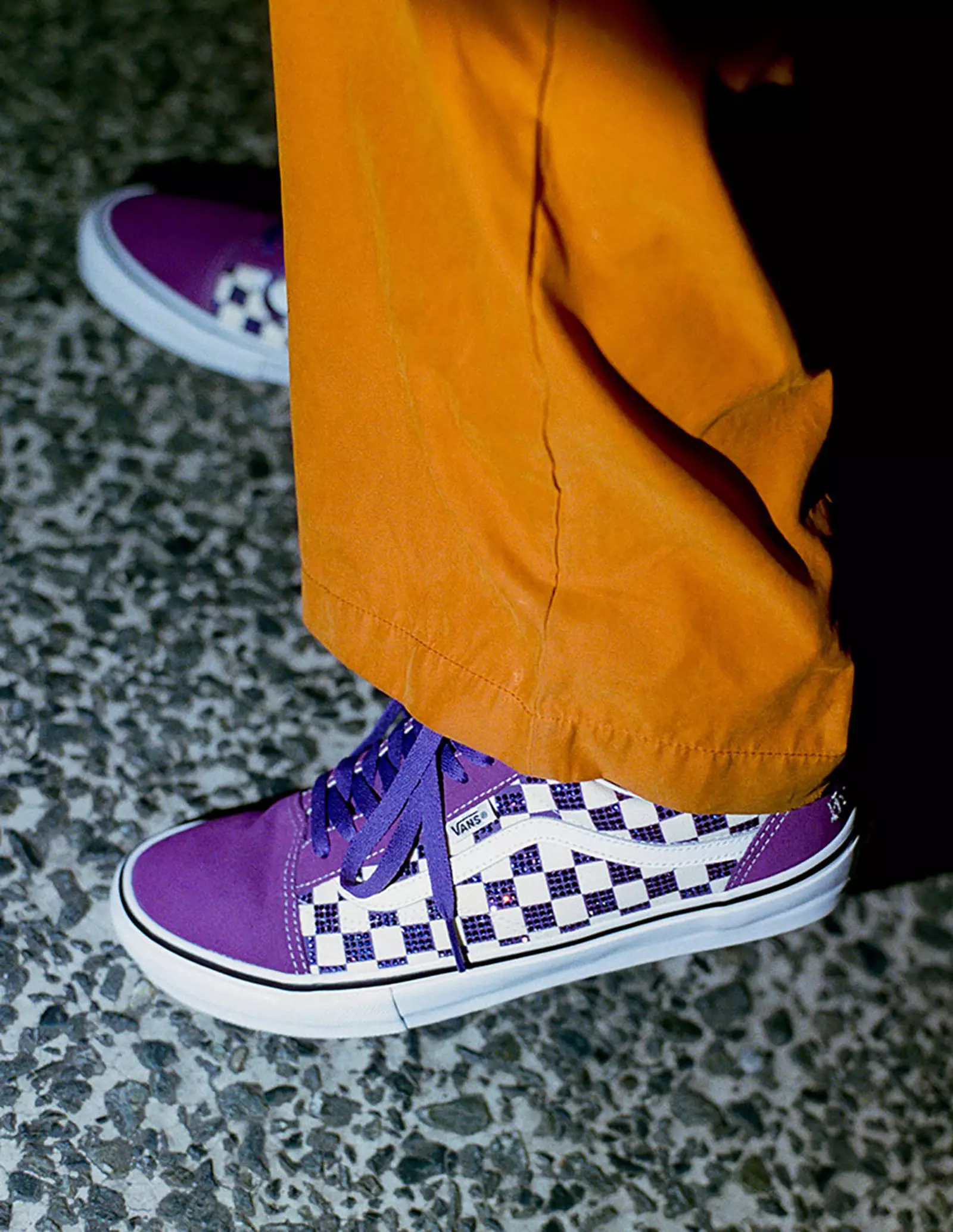 En negro, marrón, rojo y púrpura, la silueta perdurable se presenta con el característico estampado a cuadros de Vans. Pero las cosas son un poco más brillantes de lo habitual: por cortesía del proveedor de cristales, el estampado geométrico está salpicado de diamantes de imitación tonales.