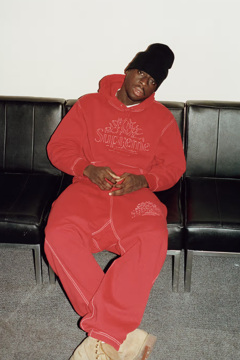 La gama concisa se completa con el conjunto de sudadera con capucha y pantalón de chándal, que se ofrece en cuatro combinaciones de colores. Los estilos a juego están marcados por una mezcla de las marcas Supreme y Timberland, junto con costuras blancas en contraste.