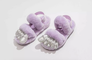 Wong ha tomado las populares sandalias esponjosas de UGG, las Fluff Oh Yeahs, y les ha añadido cubiertas plateadas y doradas en forma de puntera. El diseñador en ciernes también ofrece calcomanías opcionales que se pueden aplicar a las uñas de imitación del zapato, llevando el estilo a un nivel superior.