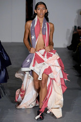 El acid denim lavado entremezclado con las mallas de rock n roll y los volúmenes hicieron que los asistentes no entendiesen nada. Pero así es Vaquera, irreverente en todas sus formas. También pudimos ver varios vestidos con la bandera americana y un sujetador con los mismos motivos. La estatua de la libertad estaría más que orgullosa.