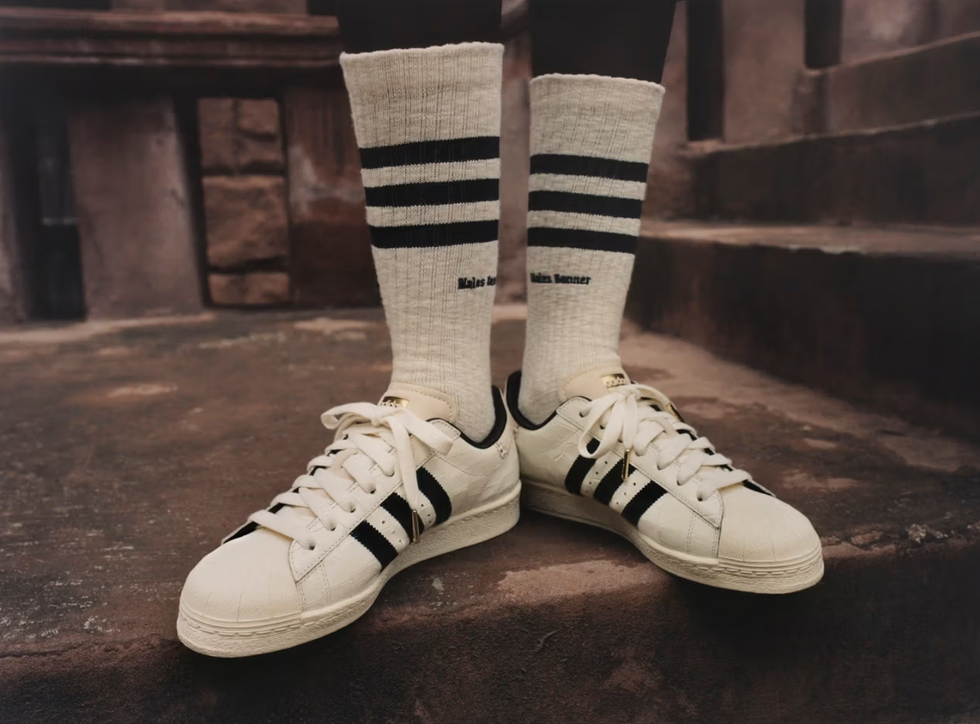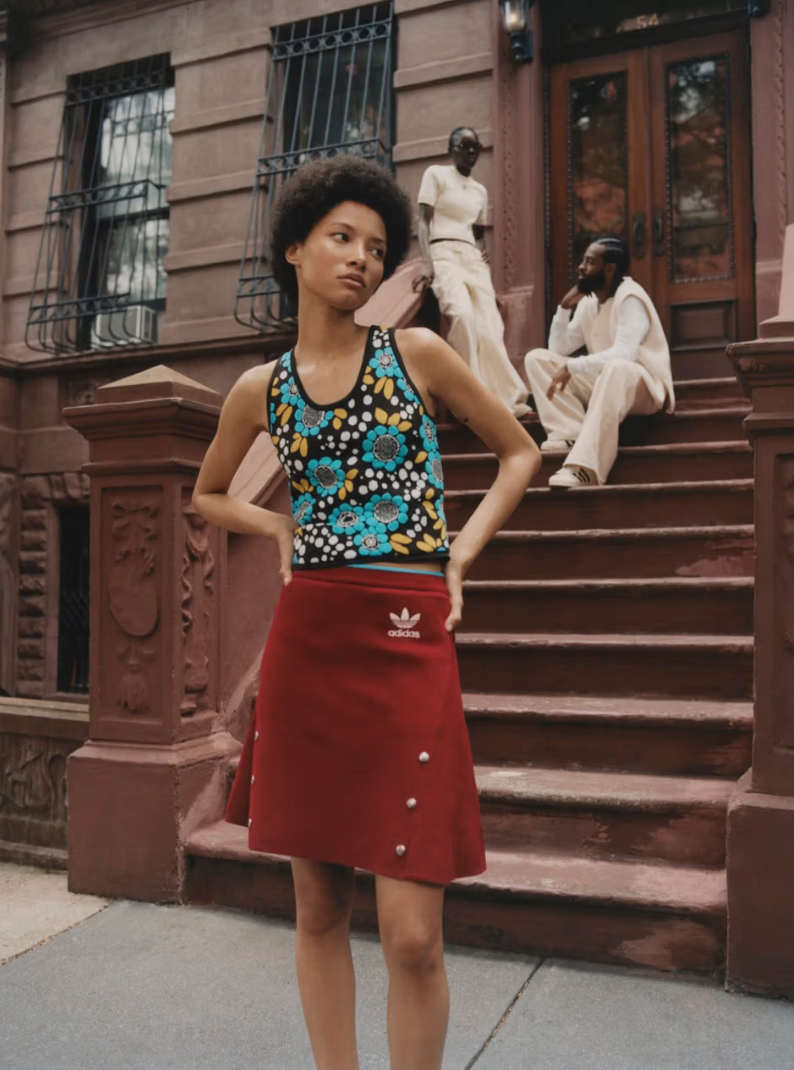 La nueva línea evoluciona la sofisticada estética deportiva de colaboraciones anteriores, incorporando chándales clásicos, sudaderas con capucha y prendas exteriores, junto a estilos renovados como chalecos florales, pantalones cortos coordinados y tops. El calzado sigue siendo el protagonista, con la emblemática Superstar y nuevas versiones de la popular Samba, que se ha agotado rápidamente. La Superstar se presenta con dos opciones de cuero con estampado de cocodrilo, mientras que la Samba Millenium se ofrece en dos combinaciones de colores, cada una con un talón de contraste en el mismo estampado.